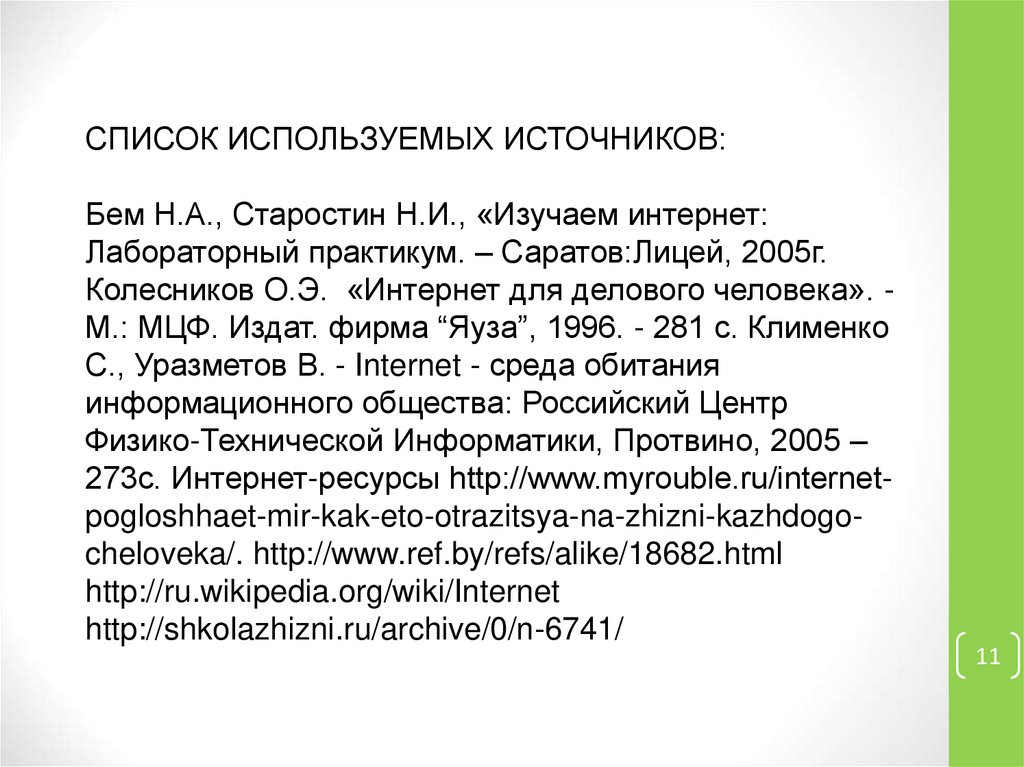 СПИСОК ИСПОЛЬЗУЕМЫХ ИСТОЧНИКОВ:Бем Н.А., Старостин Н.И., «Изучаем интернет:
