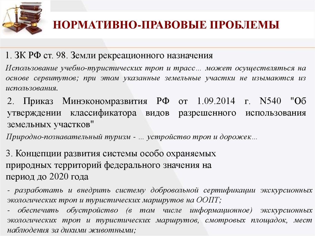НОРМАТИВНО-ПРАВОВЫЕ ПРОБЛЕМЫ1. ЗК РФ ст. 98. Земли рекреационного назначения