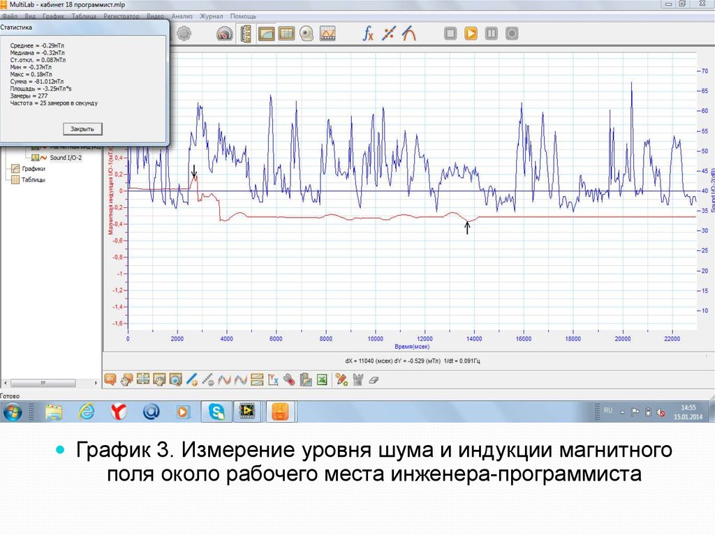 График 3. Измерение уровня шума и индукции магнитногополя около рабочего места инженера-программиста