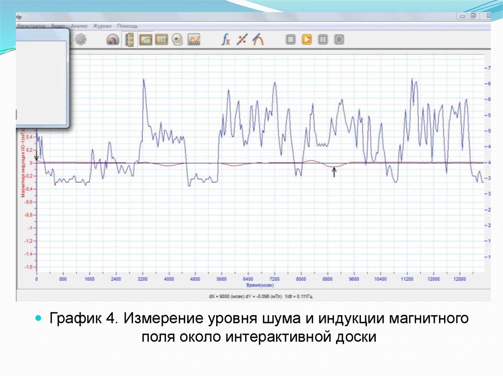 График 4. Измерение уровня шума и индукции магнитногополя около интерактивной доски