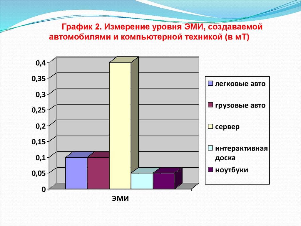 График 2. Измерение уровня ЭМИ, создаваемойавтомобилями и компьютерной техникой (в мТ)