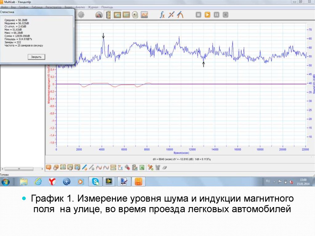 График 1. Измерение уровня шума и индукции магнитногополя на улице, во время проезда легковых автомобилей