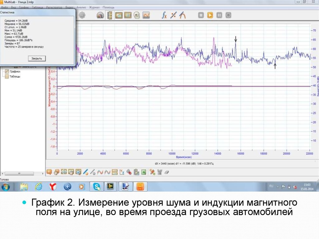 График 2. Измерение уровня шума и индукции магнитногополя на улице, во время проезда грузовых автомобилей