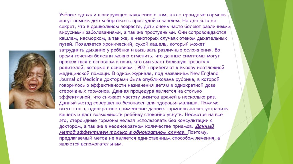 Учёные сделали шокирующее заявление о том, что стероидные гормонымогут помочь детям бороться с простудой и кашлем. Не для кого не