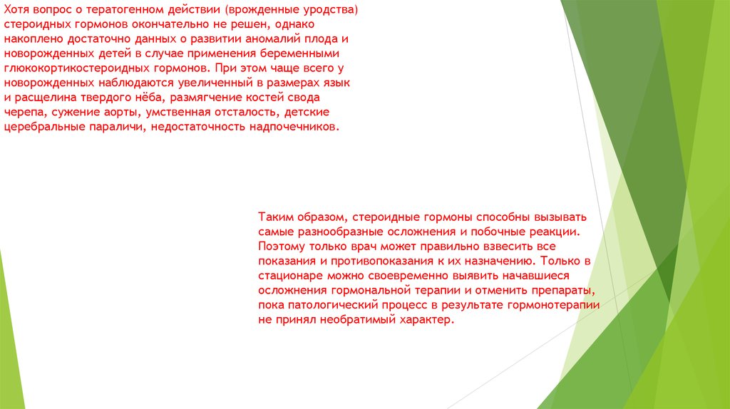 Хотя вопрос о тератогенном действии (врожденные уродства)стероидных гормонов окончательно не решен, однако