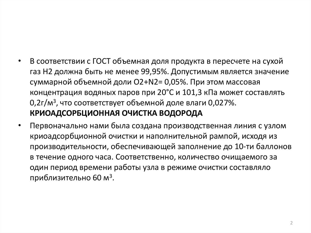 • В соответствии с ГОСТ объемная доля продукта в пересчете на сухойгаз Н2 должна быть не менее 99,95%. Допустимым является значение