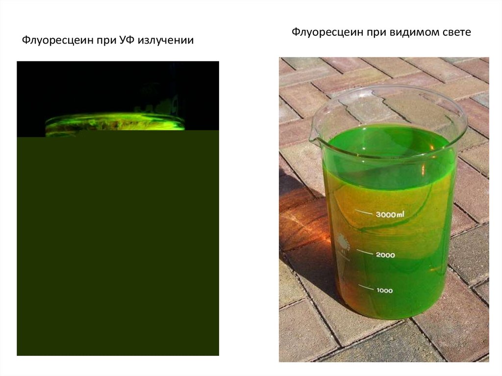 Флуоресцеин при УФ излученииФлуоресцеин при видимом свете