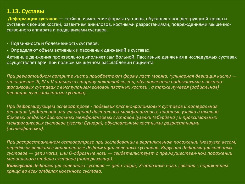 1.13. СуставыДеформация суставов — стойкое изменение формы суставов, обусловленное деструкцией хряща и