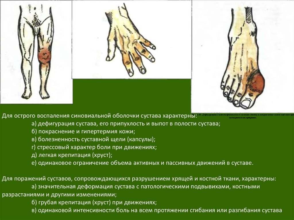 Для острого воспаления синовиальной оболочки сустава характерны:а) дефигурация сустава, его припухлость и выпот в полости сустава;