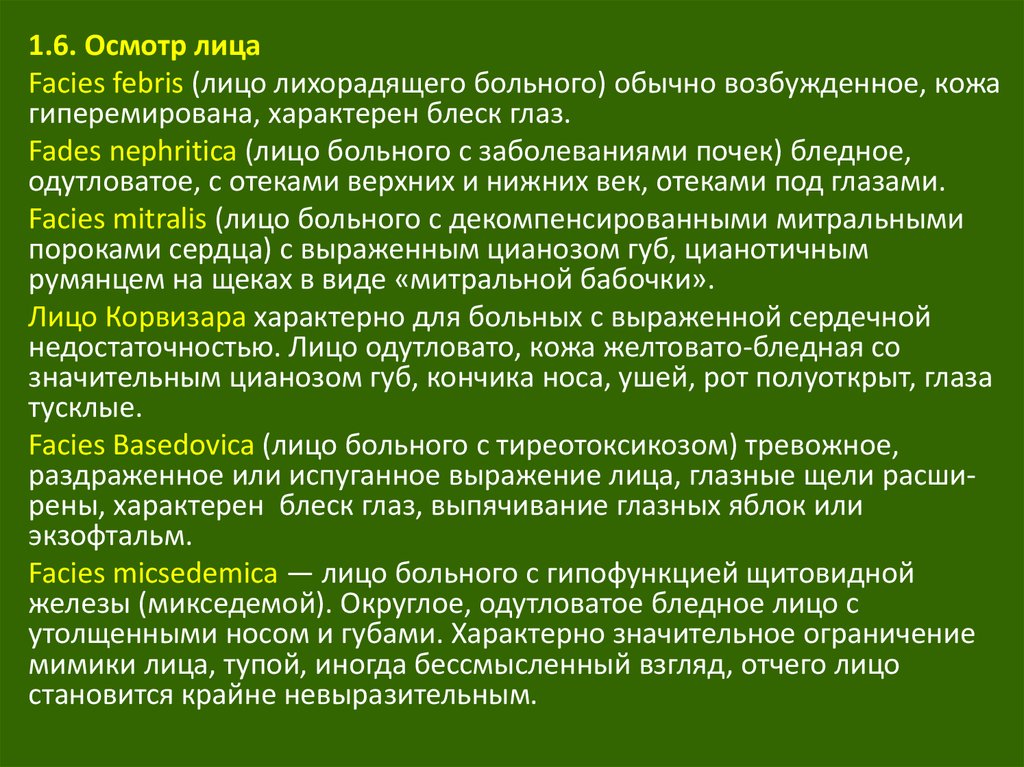 1.6. Осмотр лицаFacies febris (лицо лихорадящего больного) обычно возбужденное, кожа