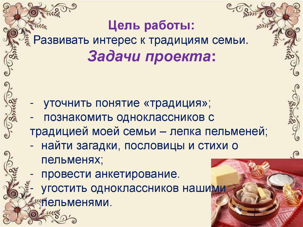 Цель работы:Развивать интерес к традициям семьи.