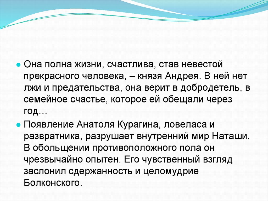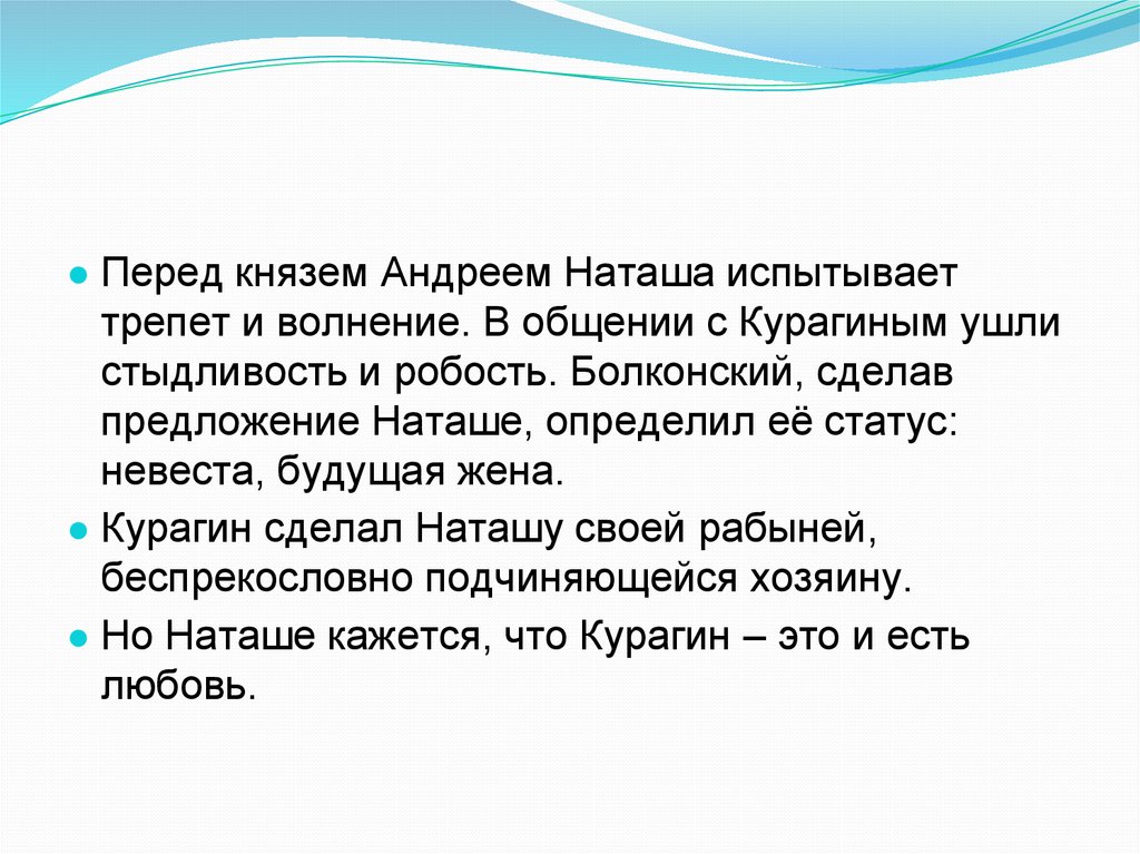 ● Перед князем Андреем Наташа испытываеттрепет и волнение. В общении с Курагиным ушли