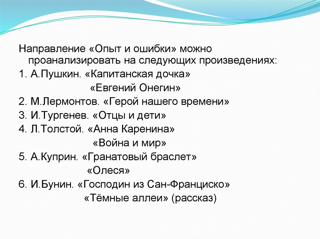 Направление «Опыт и ошибки» можнопроанализировать на следующих произведениях: