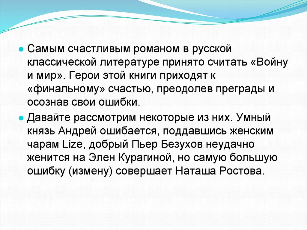 ● Самым счастливым романом в русскойклассической литературе принято считать «Войну