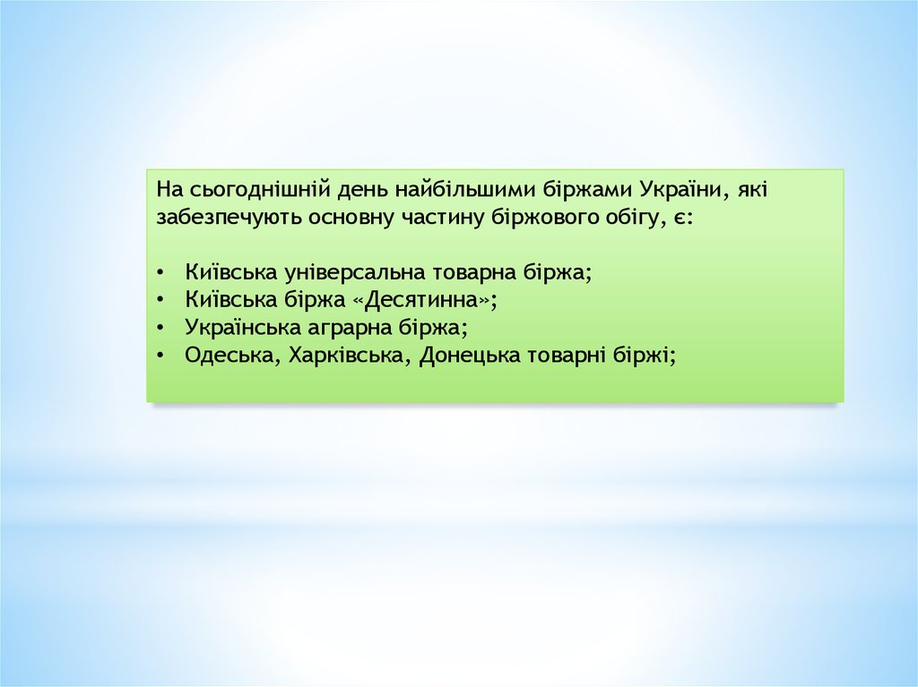 На сьогоднішній день найбільшими біржами України, якізабезпечують основну частину біржового обігу, є: