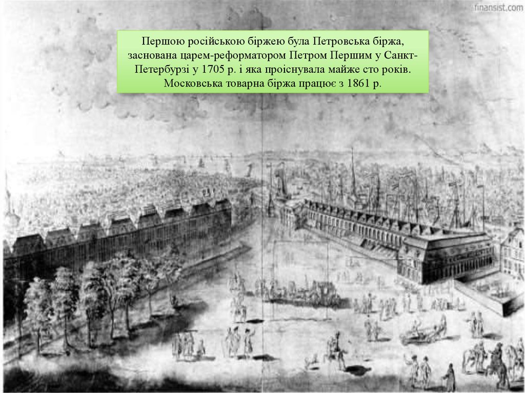 Першою російською біржею була Петровська біржа,заснована царем-реформатором Петром Першим у СанктПетербурзі у 1705 р. і яка проіснувала майже сто років.