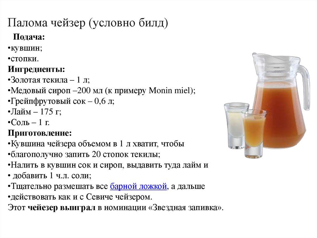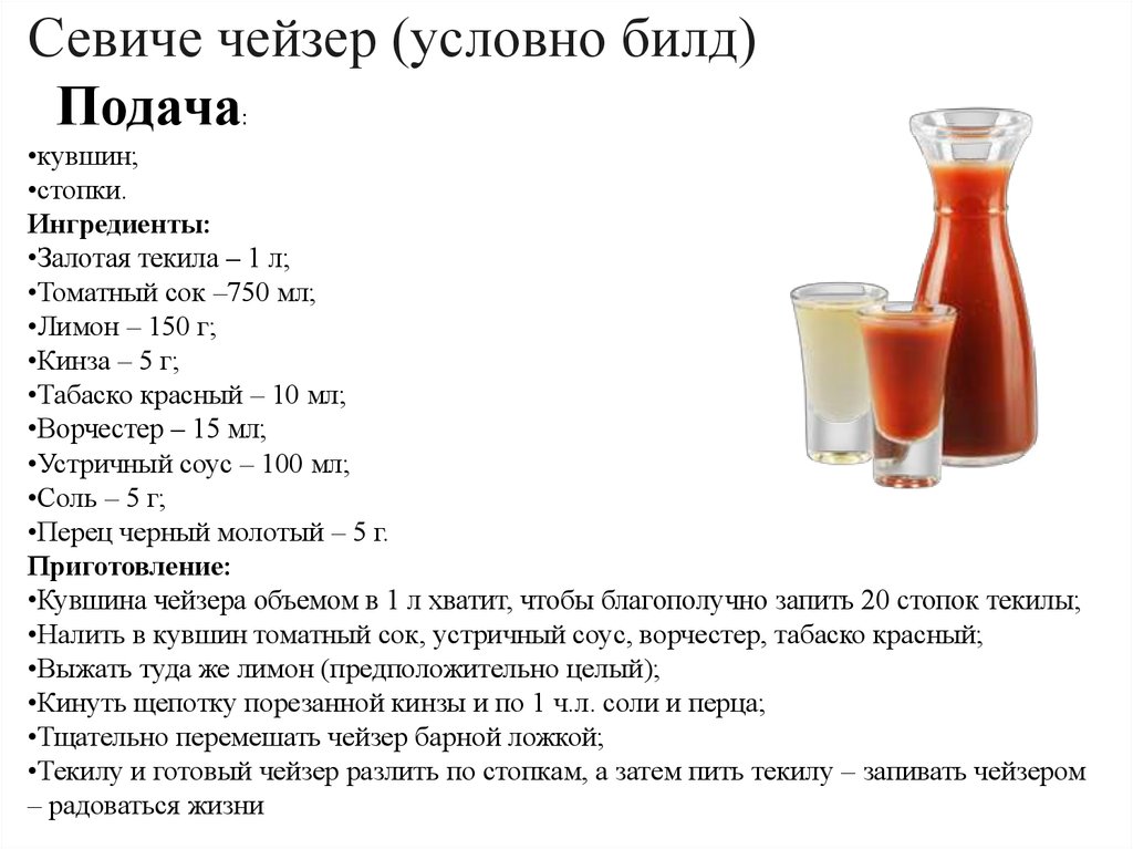 •Кувшина чейзера объемом в 1 л хватит, чтобы благополучно запить 20 стопок текилы;