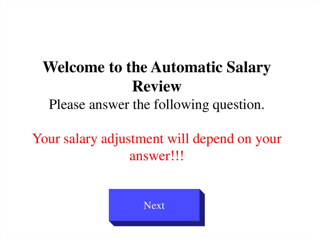 Welcome to the Automatic Salary Review. Please answer the following question. Your salary adjustment will depend on your answer