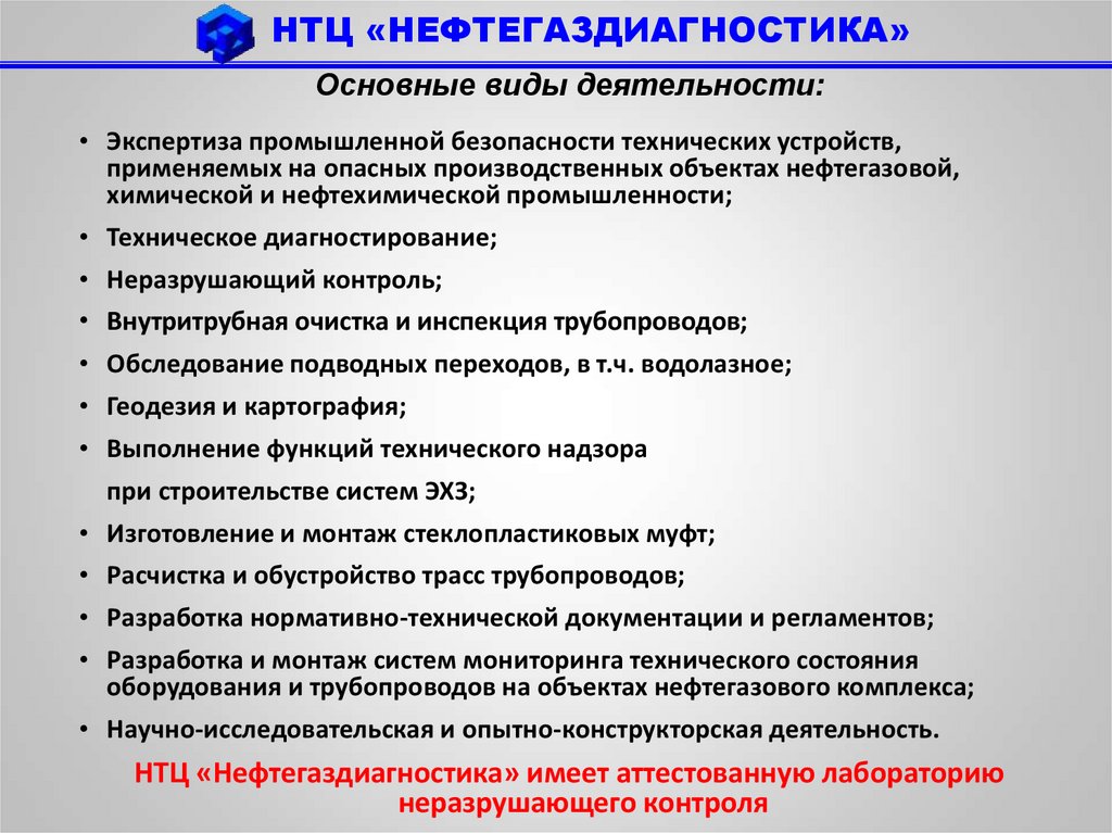 НТЦ «НЕФТЕГАЗДИАГНОСТИКА»Основные виды деятельности: