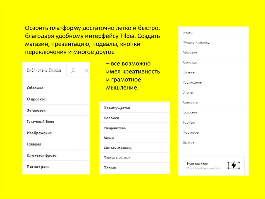 Освоить платформу достаточно легко и быстро,благодаря удобному интерфейсу Tildы. Создать