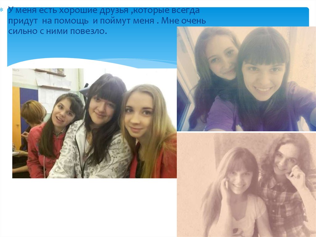 У меня есть хорошие друзья ,которые всегдапридут на помощь и поймут меня . Мне очень