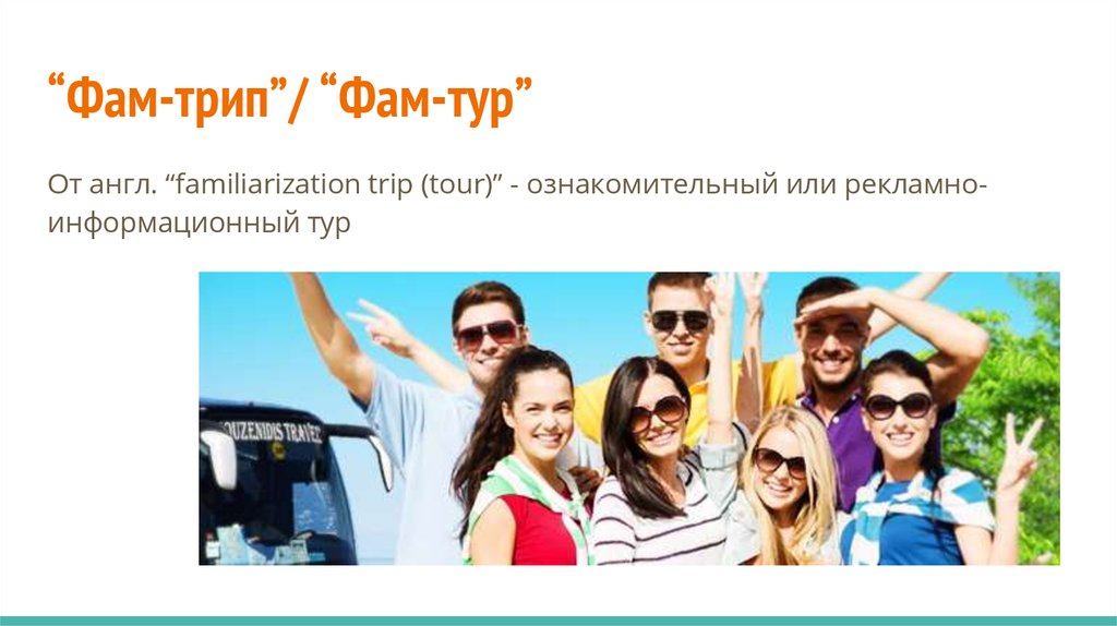 “Фам-трип”/ “Фам-тур”От англ. “familiarization trip (tour)” - ознакомительный или рекламноинформационный тур