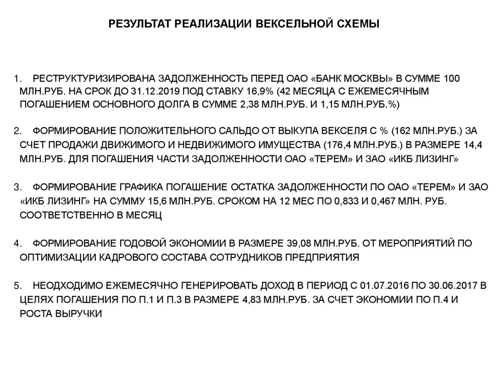 РЕЗУЛЬТАТ РЕАЛИЗАЦИИ ВЕКСЕЛЬНОЙ СХЕМЫ1. РЕСТРУКТУРИЗИРОВАНА ЗАДОЛЖЕННОСТЬ ПЕРЕД ОАО «БАНК МОСКВЫ» В СУММЕ 100
