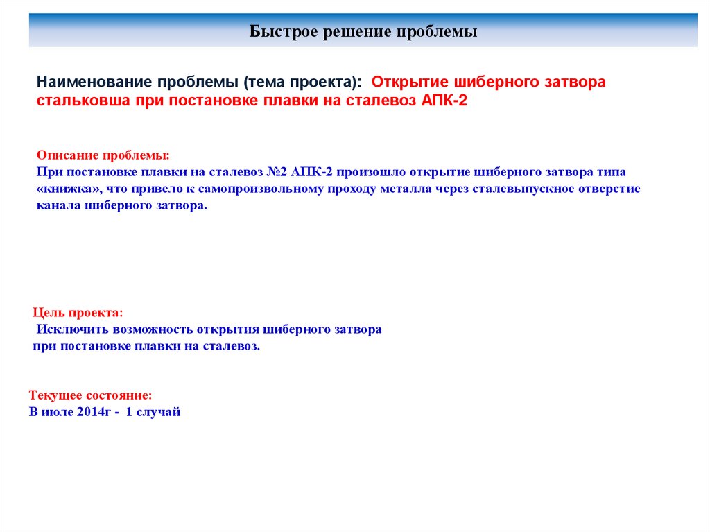Быстрое решение проблемыНаименование проблемы (тема проекта): Открытие шиберного затвора