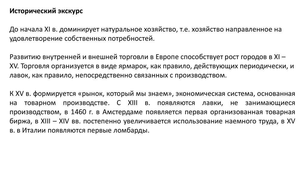 Исторический экскурсДо начала XI в. доминирует натуральное хозяйство, т.е. хозяйство направленное на
