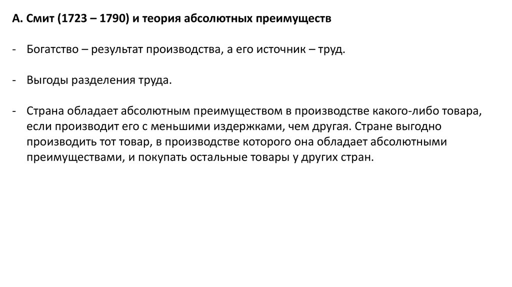 А. Смит (1723 – 1790) и теория абсолютных преимуществ- Богатство – результат производства, а его источник – труд.
