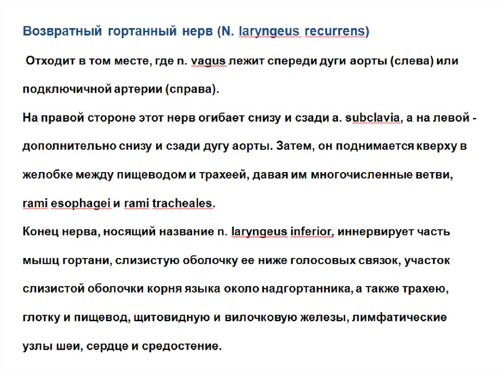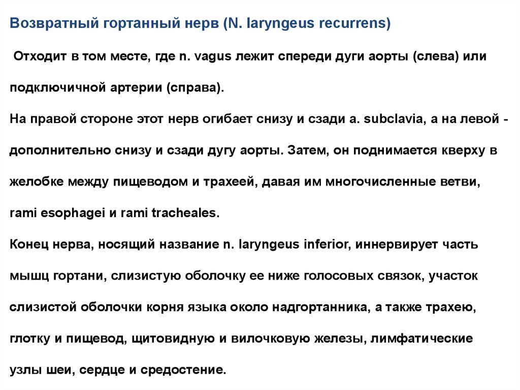 Возвратный гортанный нерв (N. laryngeus recurrens)Отходит в том месте, где n. vagus лежит спереди дуги аорты (слева) или