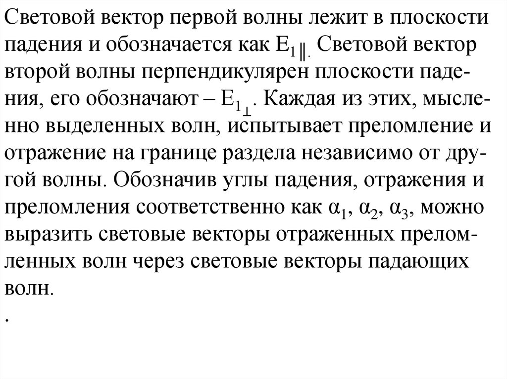 Световой вектор первой волны лежит в плоскостипадения и обозначается как E1║. Световой вектор