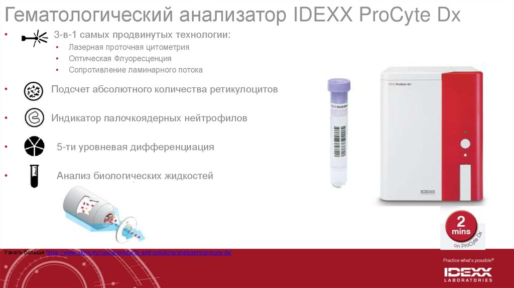 Узнать больше https://www.idexx.eu/russia/products-and-solutions/analysers/vetlab-ua-analyser/