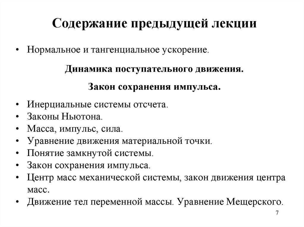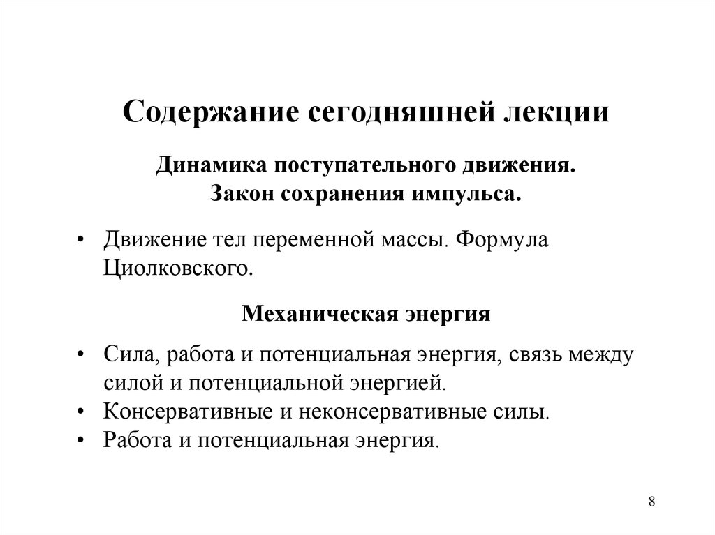 Динамика поступательного движения. Закон сохранения импульса. Формула Циолковского. Механическая энергия. (Лекция 3)