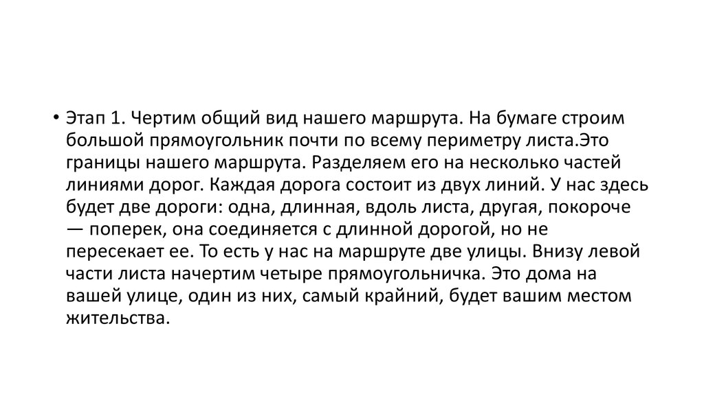• Этап 1. Чертим общий вид нашего маршрута. На бумаге строимбольшой прямоугольник почти по всему периметру листа.Это