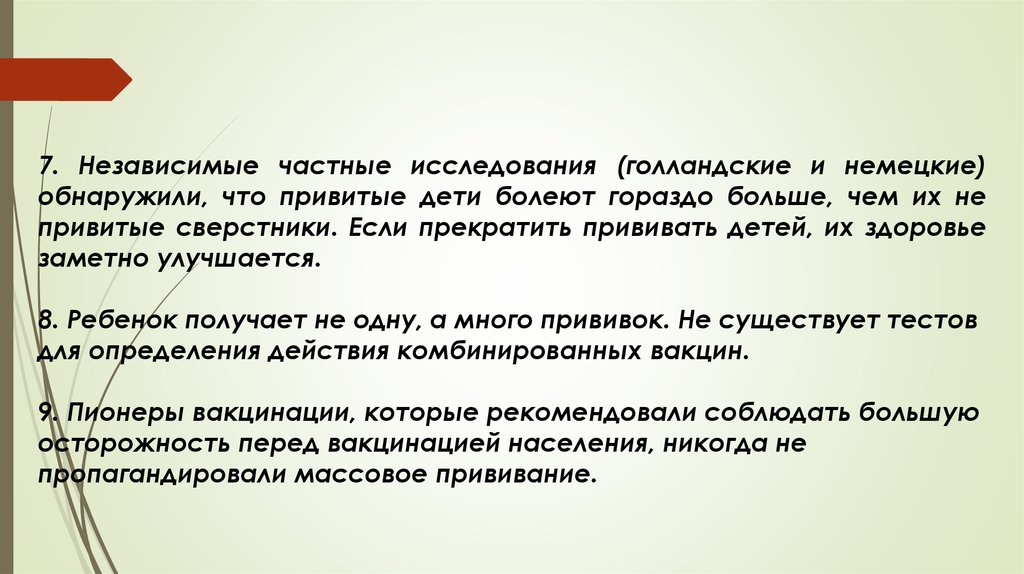 7. Независимые частные исследования (голландские и немецкие)обнаружили, что привитые дети болеют гораздо больше, чем их не