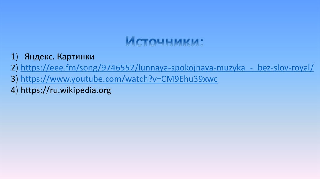 1) Яндекс. Картинки2) https://eee.fm/song/9746552/lunnaya-spokojnaya-muzyka_-_bez-slov-royal/