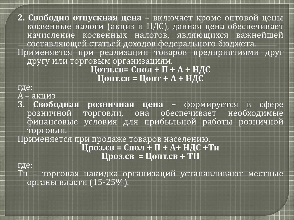 2. Свободно отпускная цена – включает кроме оптовой ценыкосвенные налоги (акциз и НДС), данная цена обеспечивает