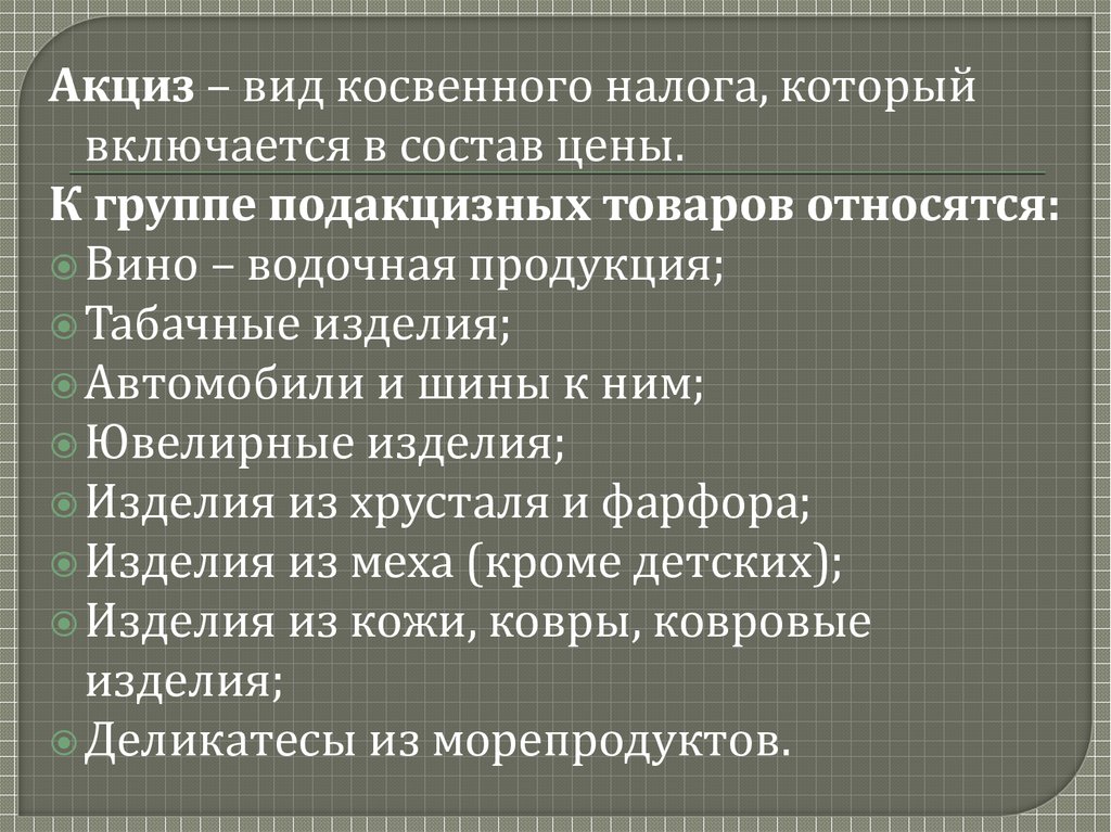Акциз – вид косвенного налога, которыйвключается в состав цены.