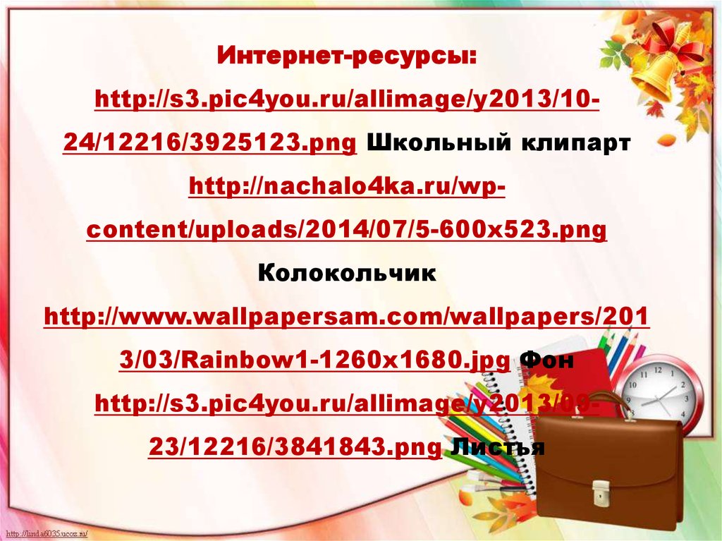 Интернет-ресурсы:http://s3.pic4you.ru/allimage/y2013/1024/12216/3925123.png Школьный клипарт