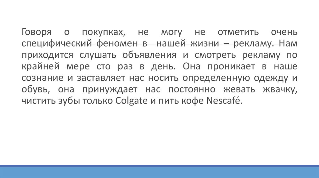 Говоря о покупках, не могу не отметить оченьспецифический феномен в нашей жизни – рекламу. Нам