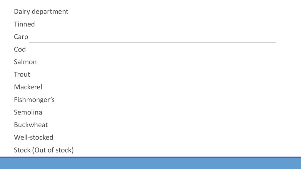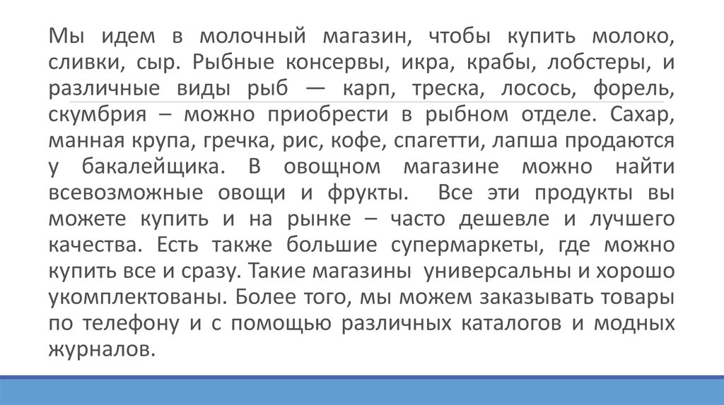 Мы идем в молочный магазин, чтобы купить молоко,сливки, сыр. Рыбные консервы, икра, крабы, лобстеры, и