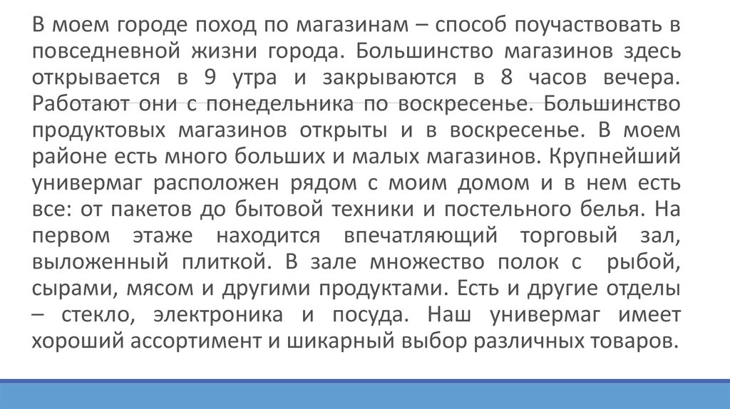 В моем городе поход по магазинам – способ поучаствовать вповседневной жизни города. Большинство магазинов здесь
