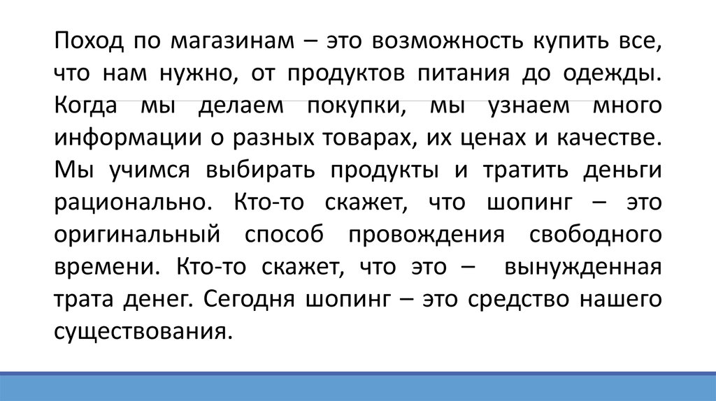 Поход по магазинам – это возможность купить все,что нам нужно, от продуктов питания до одежды.