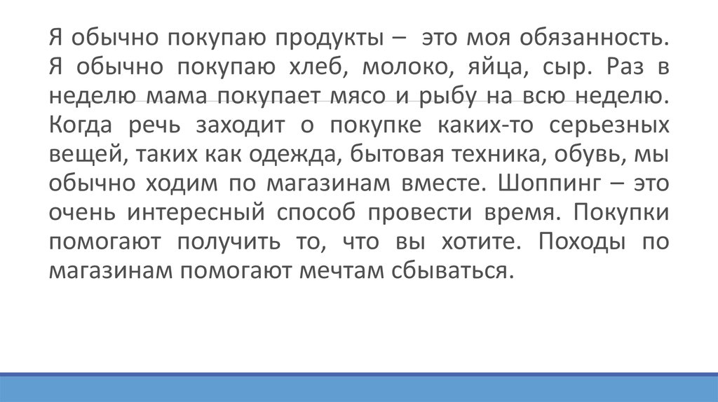 Я обычно покупаю продукты – это моя обязанность.Я обычно покупаю хлеб, молоко, яйца, сыр. Раз в