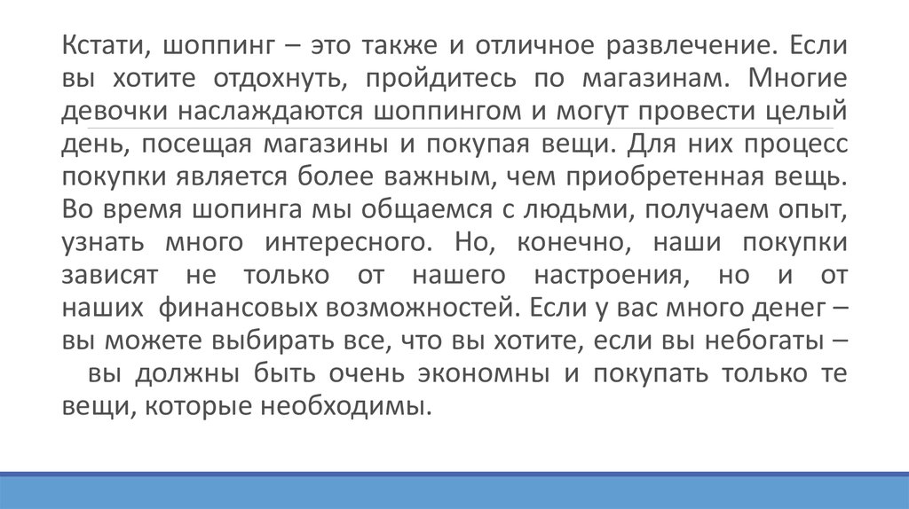 Мне нравится ходить по магазинам. Мне нравитсяпокупать разные вещи, особенно подарки. Если я