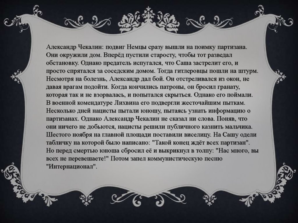 Александр Чекалин: подвиг Немцы сразу вышли на поимку партизана.Они окружили дом. Вперёд пустили старосту, чтобы тот разведал