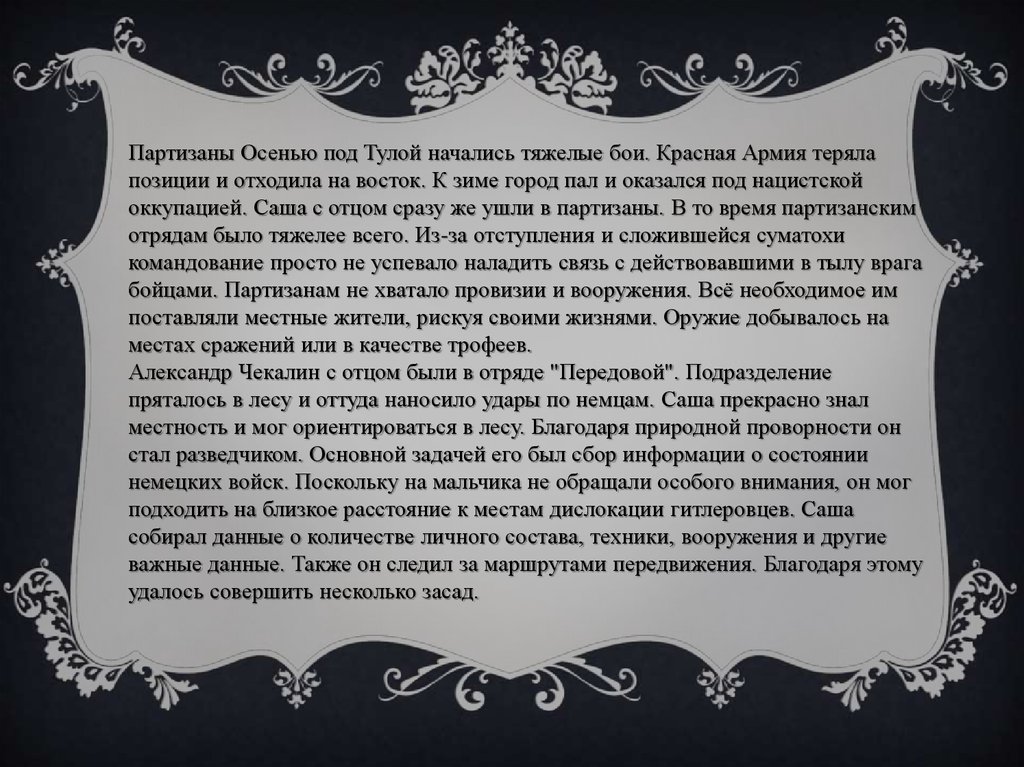 Партизаны Осенью под Тулой начались тяжелые бои. Красная Армия терялапозиции и отходила на восток. К зиме город пал и оказался под нацистской