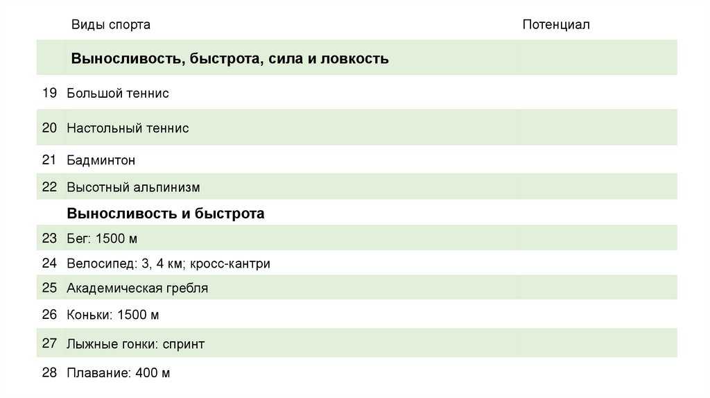 Виды спортаБыстрота, сила, выносливость, ловкость и гибкость