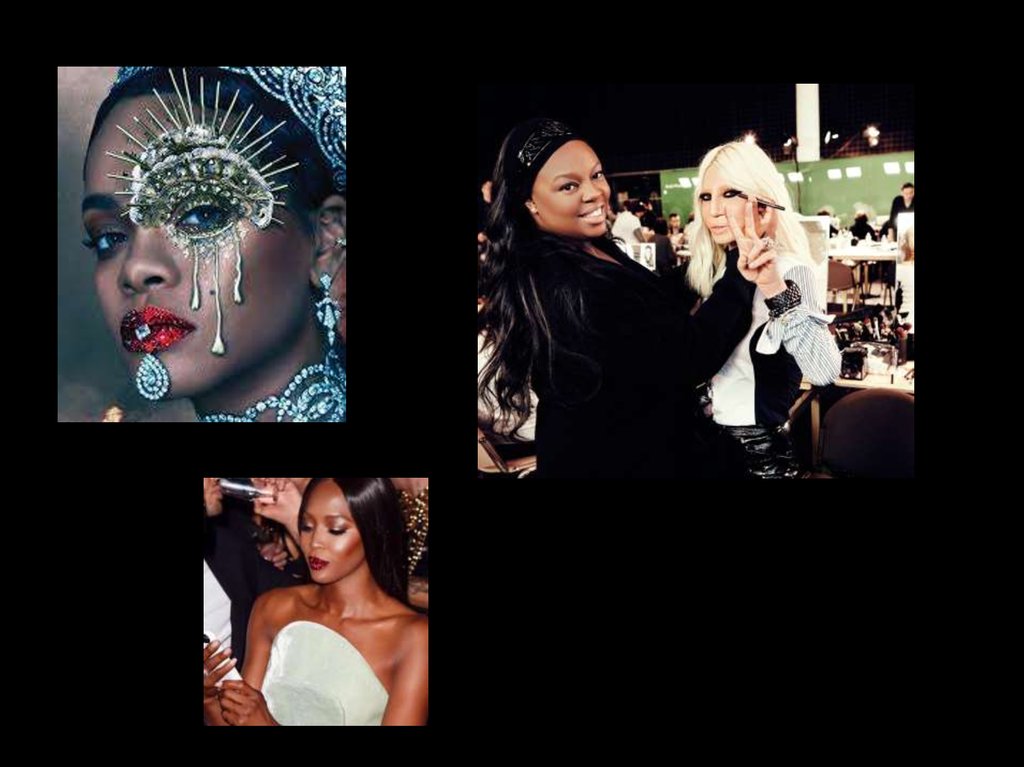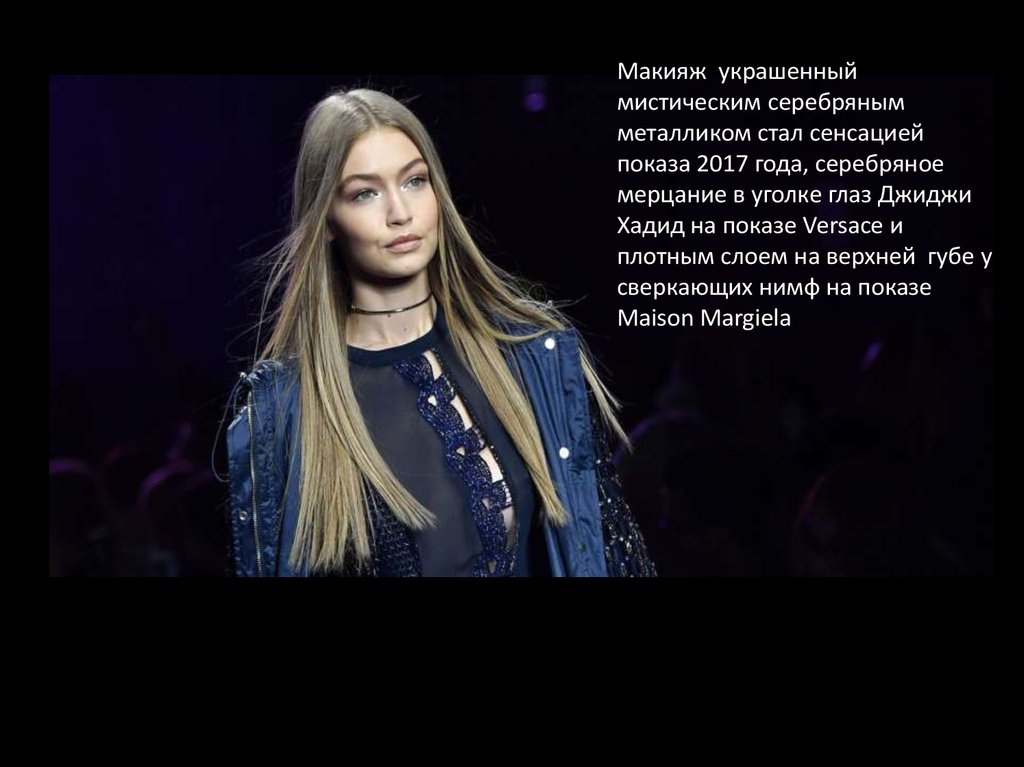 За кулисами показа визажист нанося сверкающиймакияж на глаза и губы из небольших безымянных